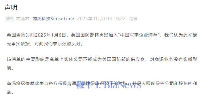 鞭牛士 1月7日音讯,商汤科技当天上昼发布声明称,好意思国当地时辰2025年1月6日,好意思国国防部将商汤加入“中国军事企业清单”。咱们合计此举毫无事实依据,对此咱们暗意热烈反对。
