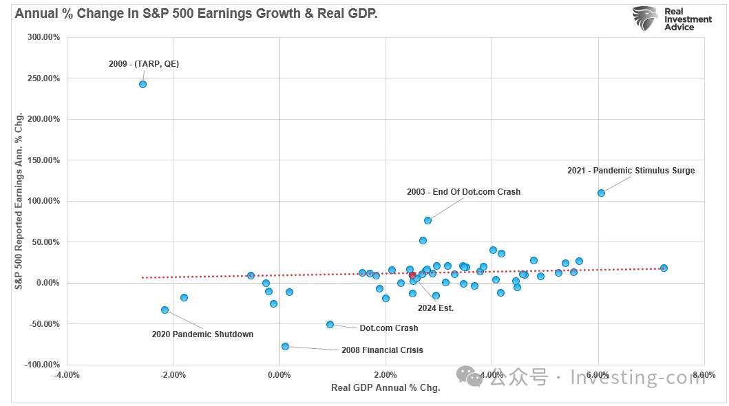 要更直不雅地意会这一不雅点,不错望望盈利增常年度变化与经通胀调换后的GDP之间的关联性。随机盈利会偏离基础经济步履,惟这些时期时常发生在经济衰败前或后的盈利波动中。面前,经济和盈利增长与永恒关联性相配接近。