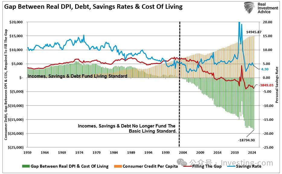 下图通过展示活命成本与收入和储蓄之间的“差额”,揭示了平方好意思国东谈主的逆境。为了保管刻下的活命成本,消费者必须花费一皆收入和储蓄,并每年额外举债近4000好意思元来弥补差额。