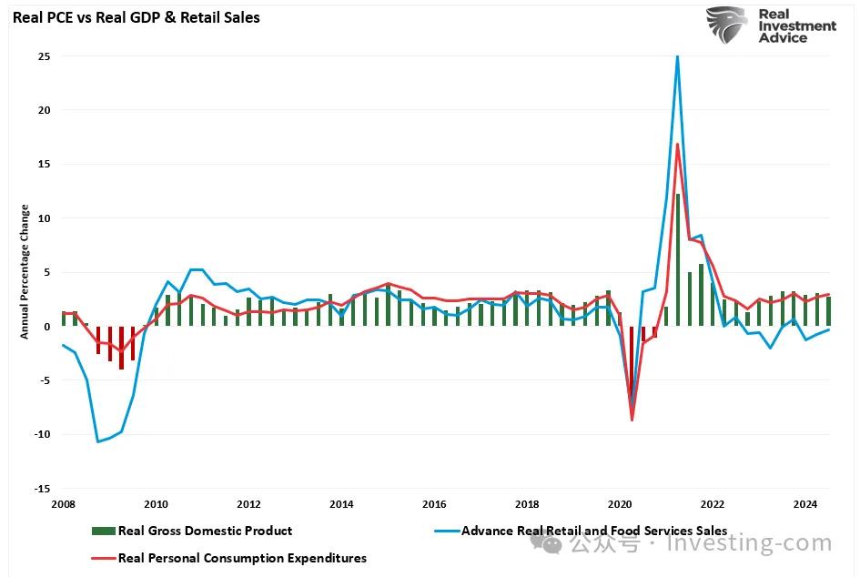参预2025年,实践个东谈主消费支拨(PCE)仍高于实践零卖额。天然这种偏差时有发生,但鉴于零卖额占PCE的约40%,这种偏差时常不会握续太久。这标明,在2025年,PCE将着手与零卖额趋同,从而导致经济增长率放缓。